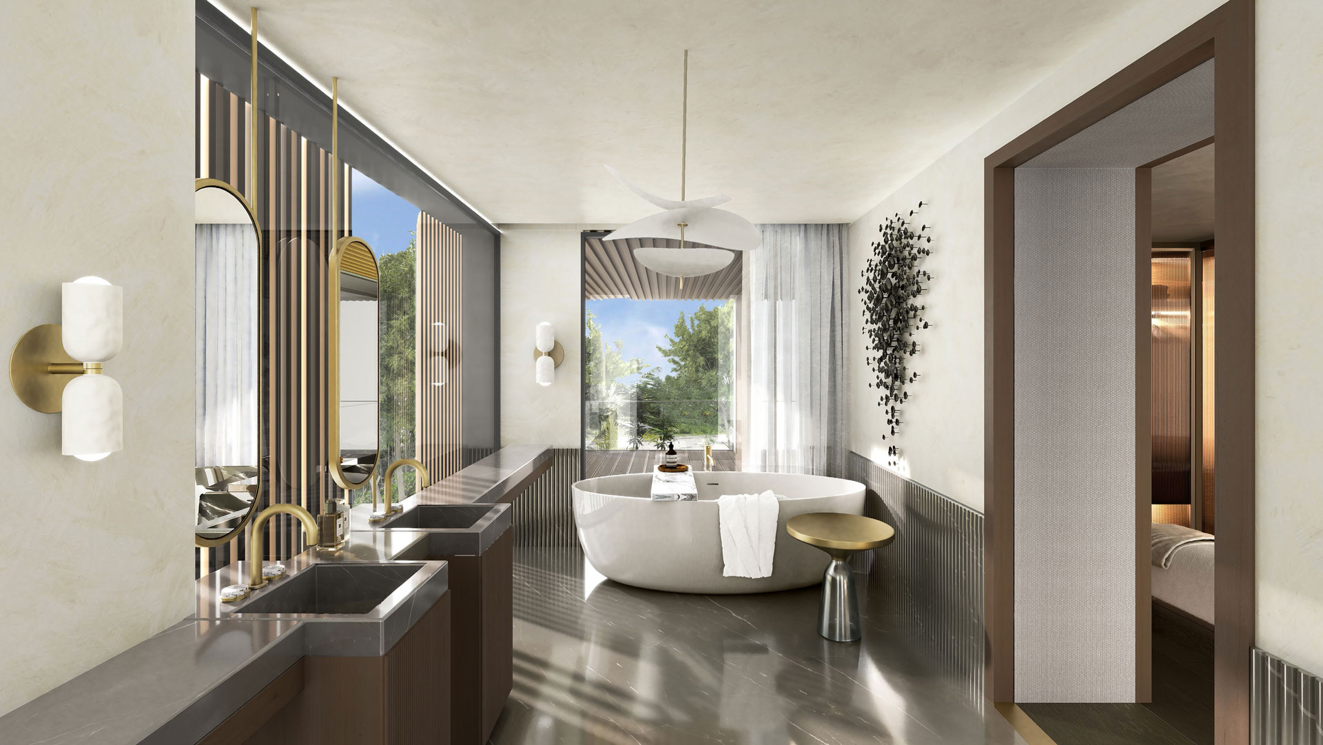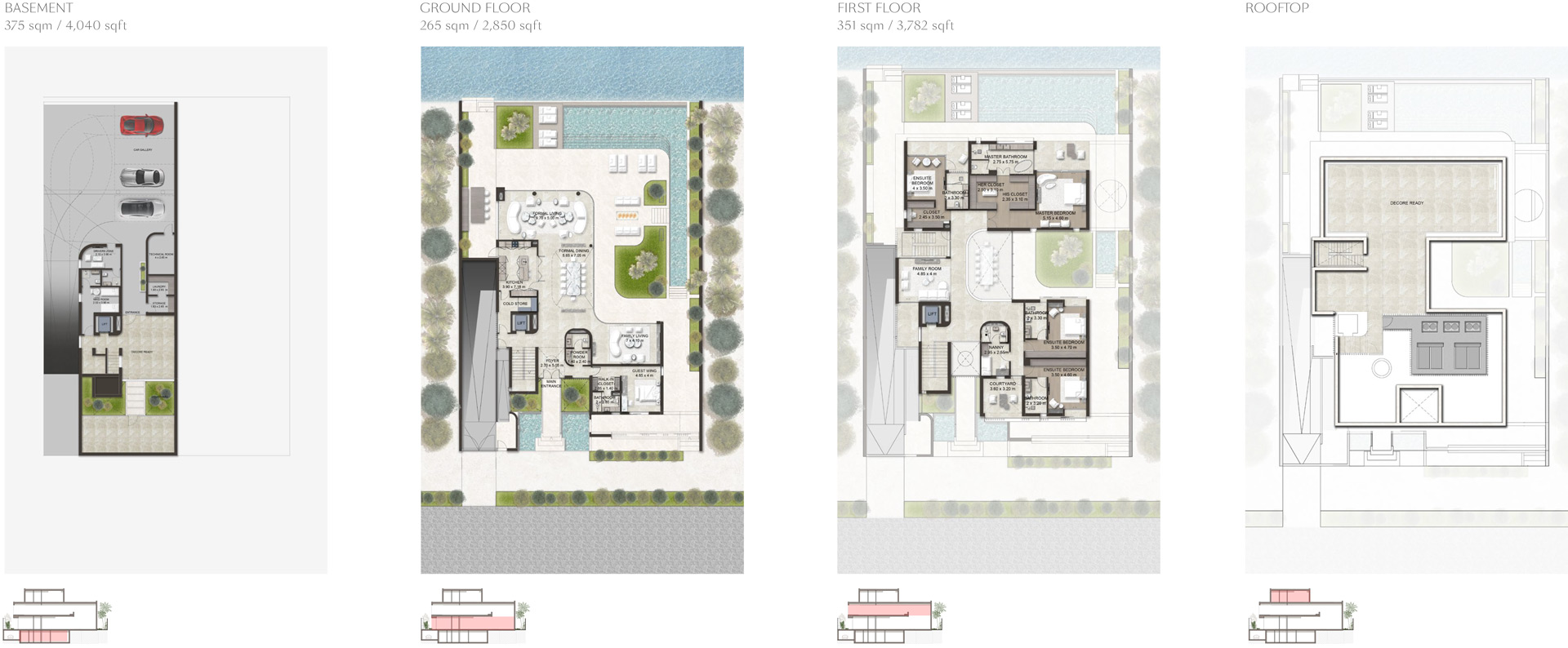 Each villa is thoughtfully designed, blending modern smart home features with timeless architecture. Interiors feature rich materials such as veined marble, carved timber, and elegant metallic finishes. Facades are customizable, with options ranging from deep stone tones to soft, earthy neutrals. High-end touches include stone-clad exteriors, marble flooring, and walk-in wardrobes with tailored fittings.